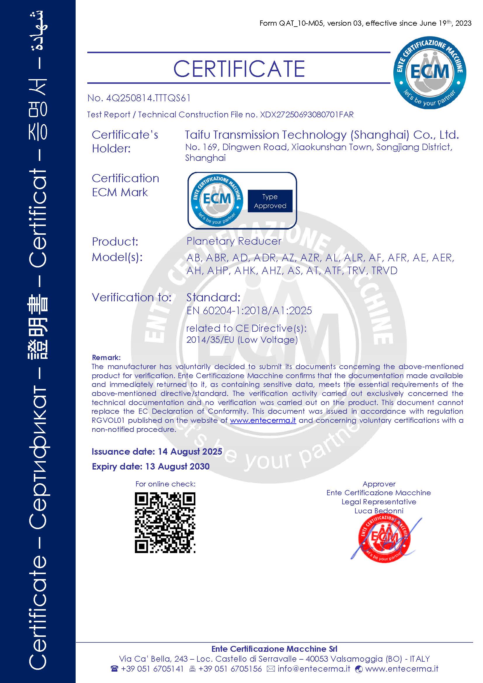 熱烈祝賀太弗傳動科技(上海)有限公司通過EN 60204-1:2018/A1:2025標(biāo)準(zhǔn)...